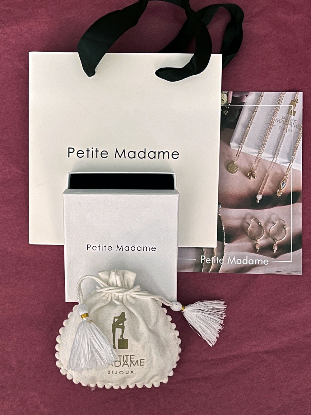 Votre bijou vous sera livré dans sa jolie pochette coton Petite Madame OU dans une boite écrin. Par soucis d'écologie merci de me préciser si vous souhaitez y ajouter un sac emballage cadeau , sac logo de la marque avec poignée tissu ruban noir.Je vous invite à cocher la case indiquée au moment de la validation de votre panier!