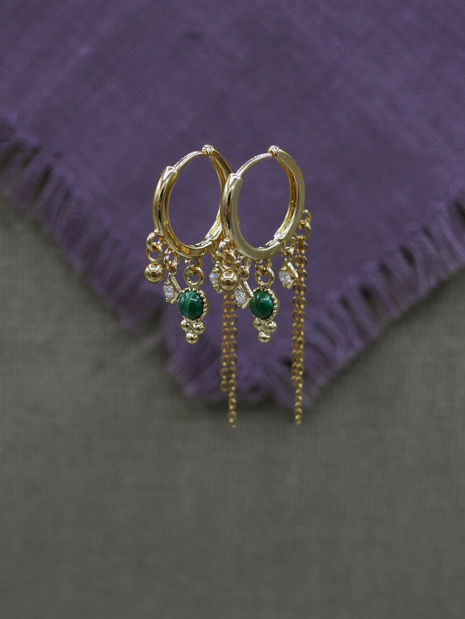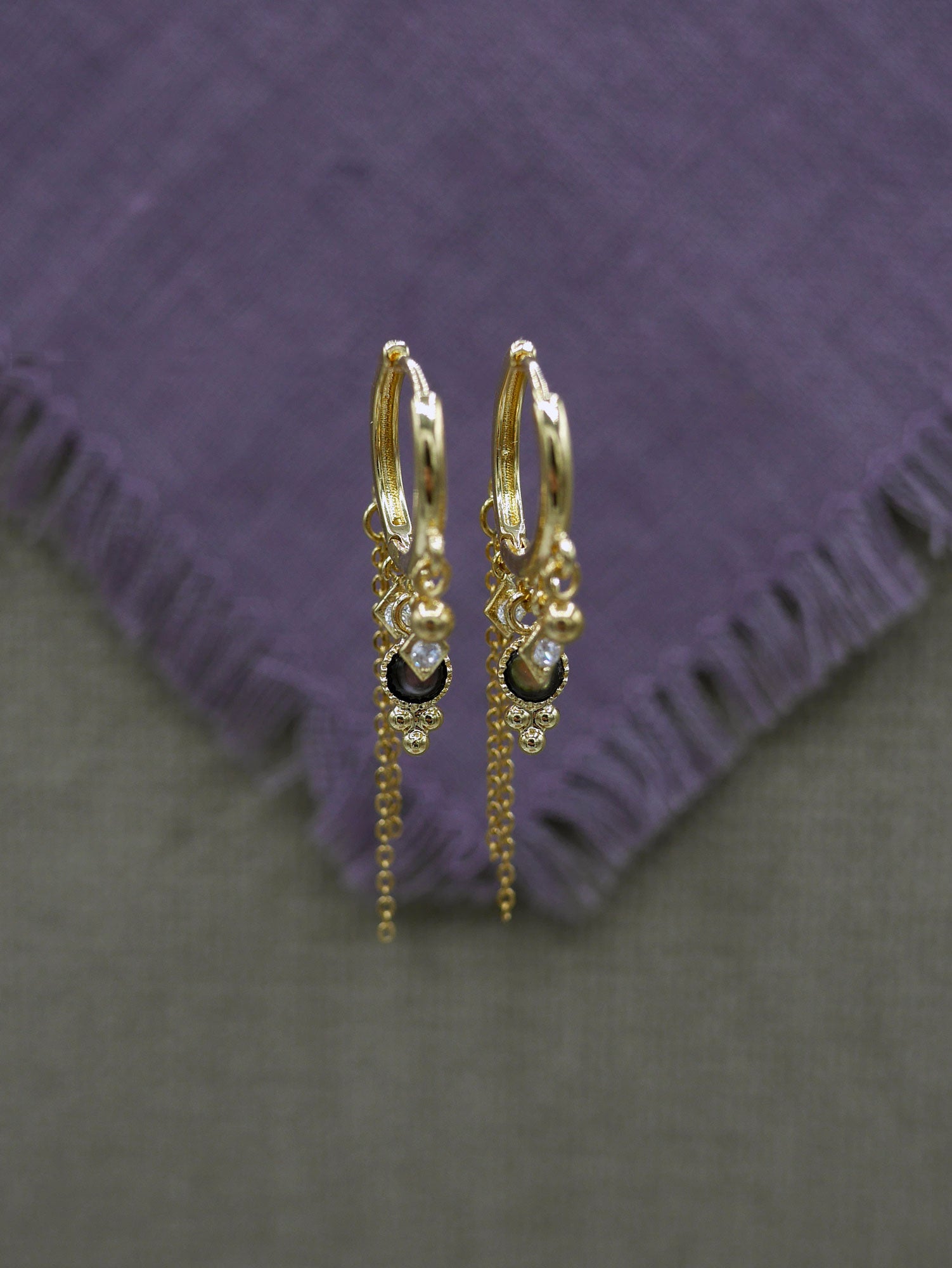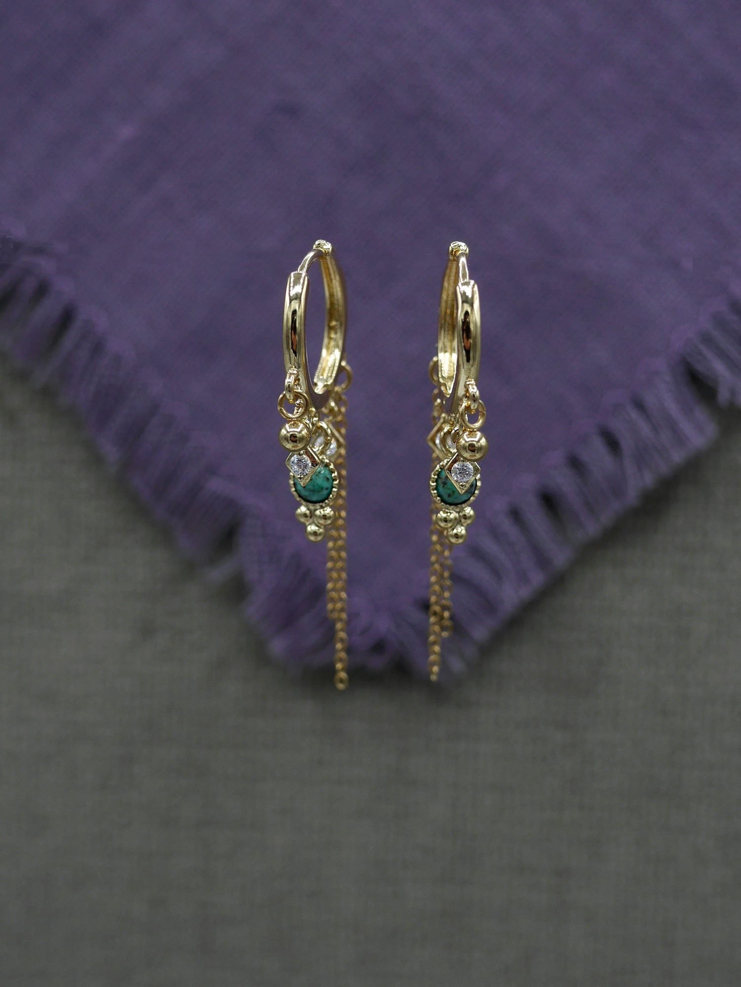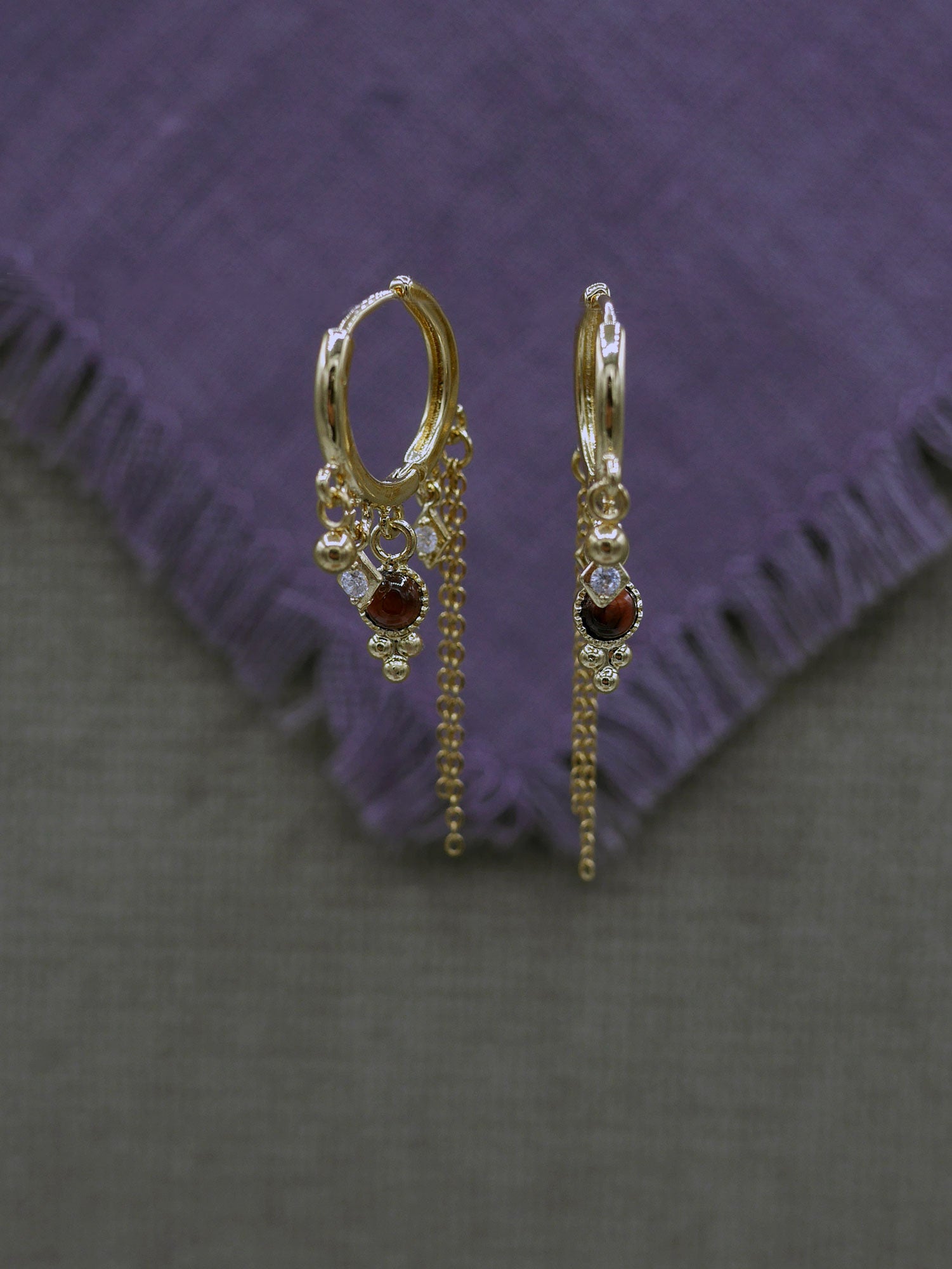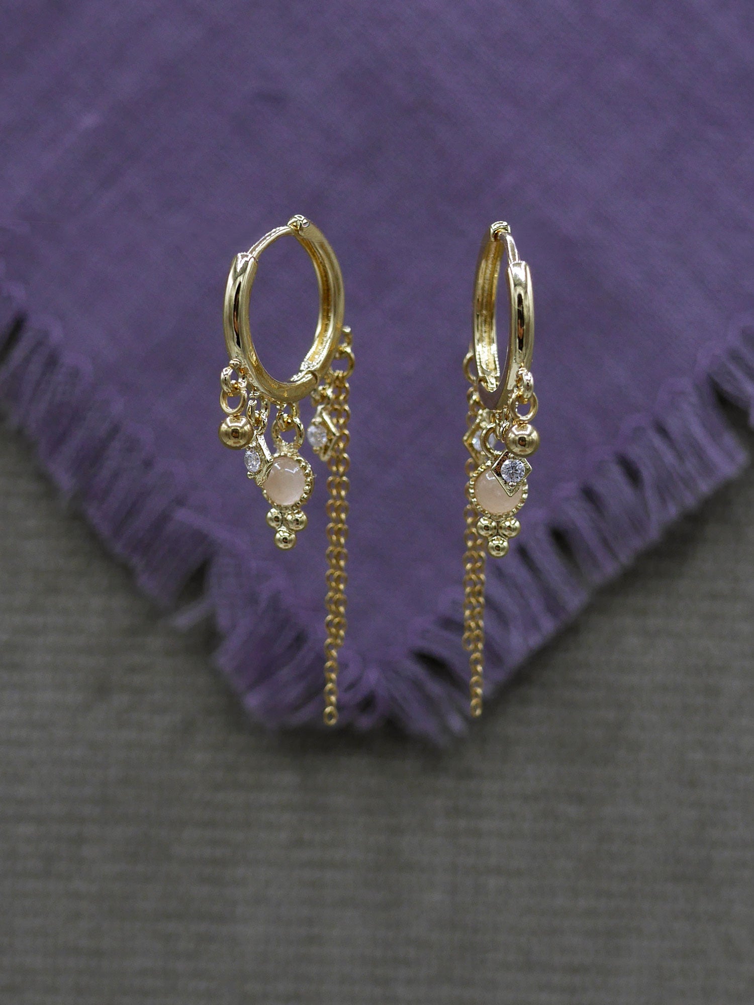 Boucles oreilles type anneau créole , composé de 5 suspensions breloques dont un motif central avec pierre naturelle de 4mm et chainette