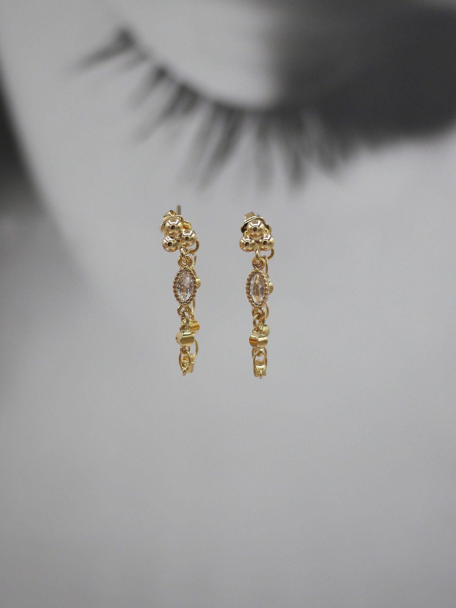 Puce oreille 3 boules soudées de 3mm , accompagnée d'un connecteur strass navette et d'une chaine lumineuse qui entoure le lobe.Vendue à la paire