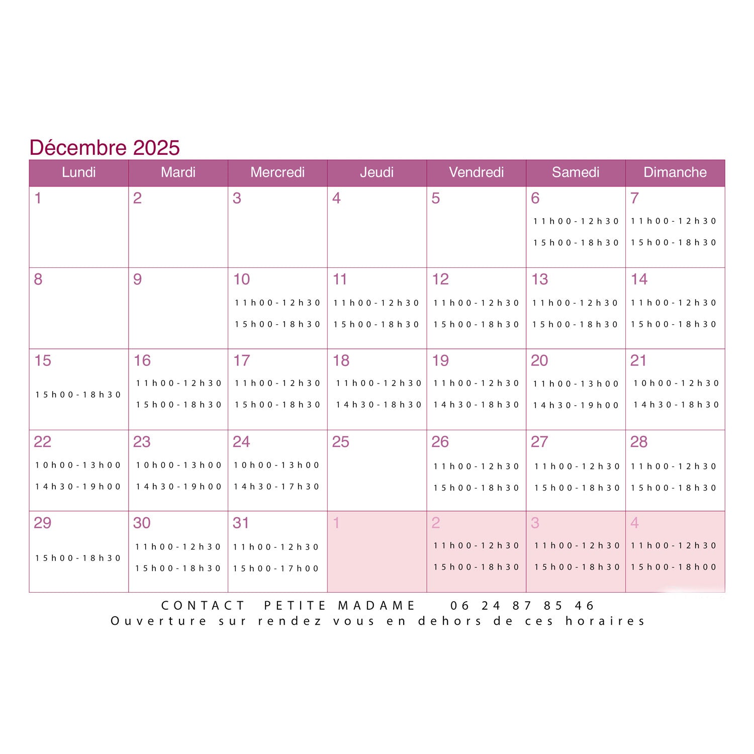 En dehors de ces horaires n 'hésitez pas à contacter Petite Madame pour ouverture sur rendez vous 0624878546